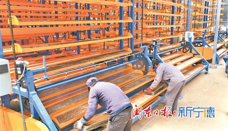 铺土、喷淋、播种、覆土、叠盘,一系列育秧工序有序运转,数名工人适时补充有机土与水稻种子,保障各环节衔接顺畅。